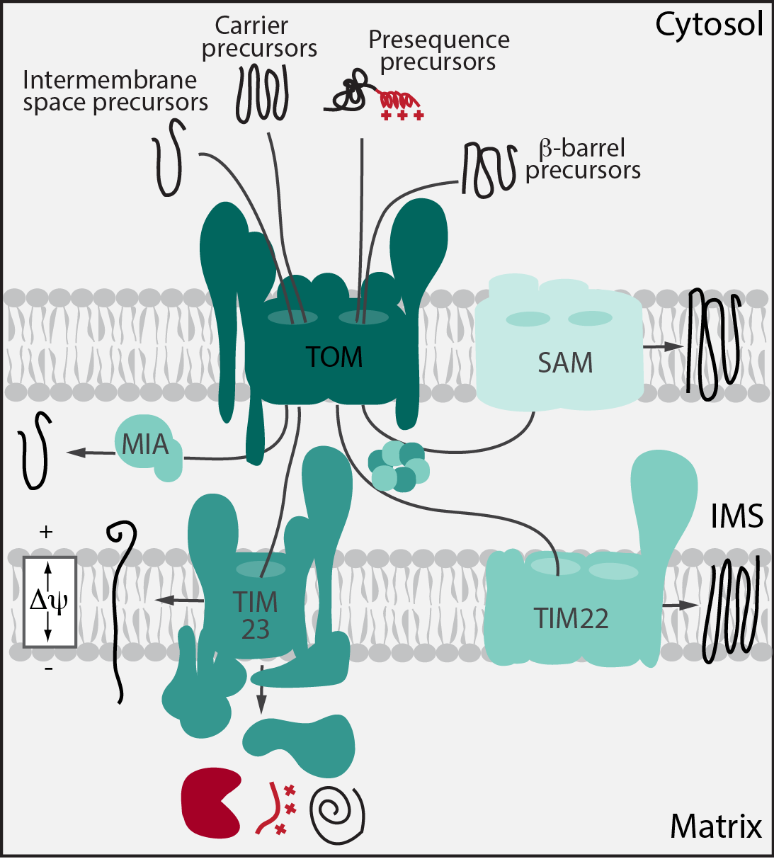 Mitochondria are equipped with more than 1000 different proteins. Most of these proteins are encoded in the nucleus and imported after their synthesis as precursors in the cytosol. Import, sorting into the respective mitochondrial subcompartment and processing of these precursor proteins is mediated by sophisticated protein machineries.